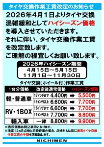 このたび、2026年4月1日よりタイヤ交換作業工賃を改定させていただくこととなりました。