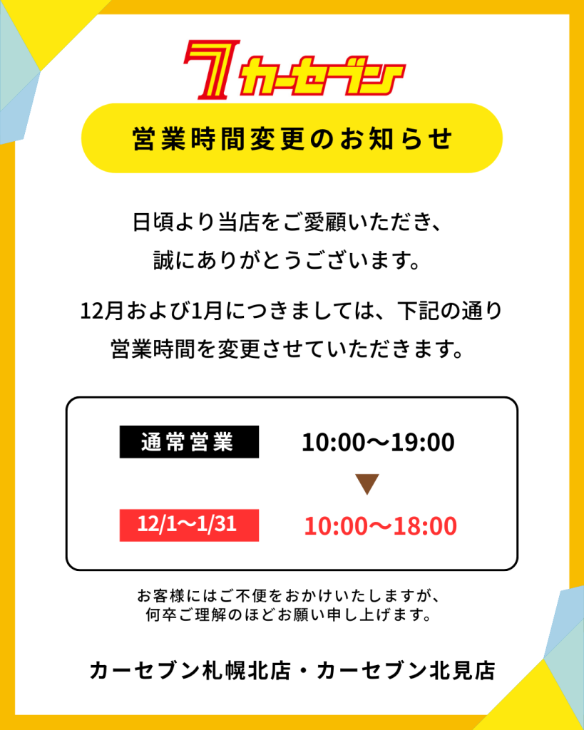 12月・1月の閉店時間について【カーセブン札幌北店・カーセブン北見店】