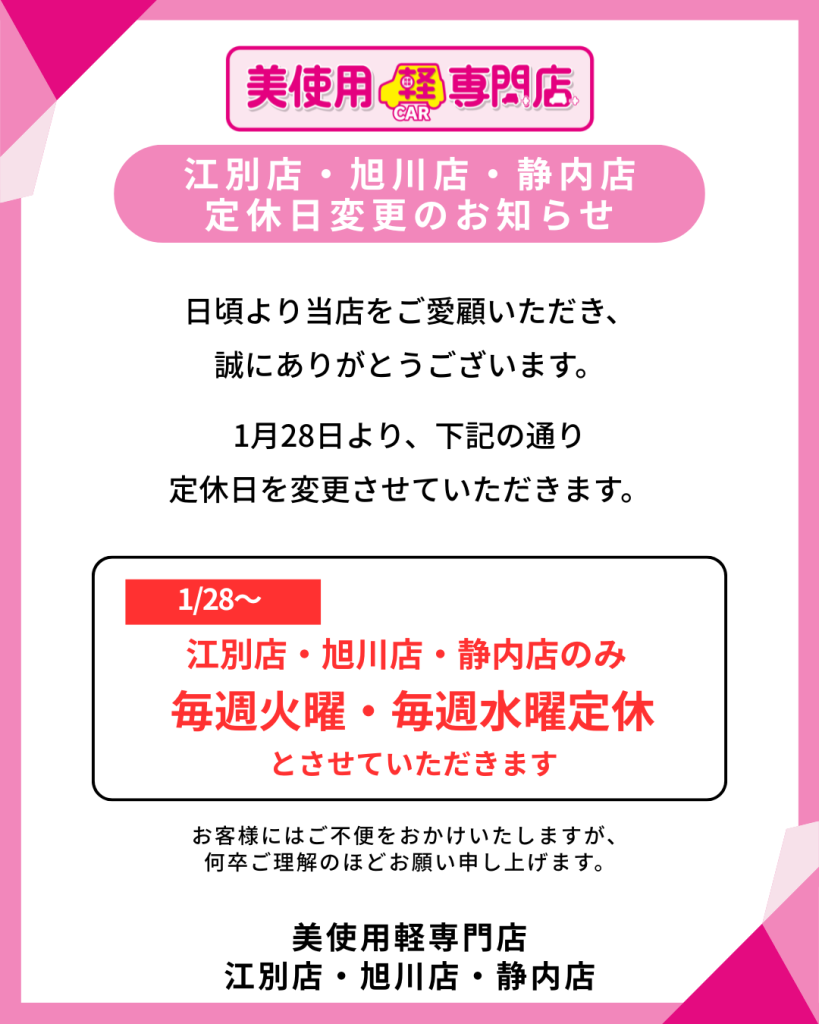 1/28~定休日変更のお知らせ(静内店・江別店・旭川店)