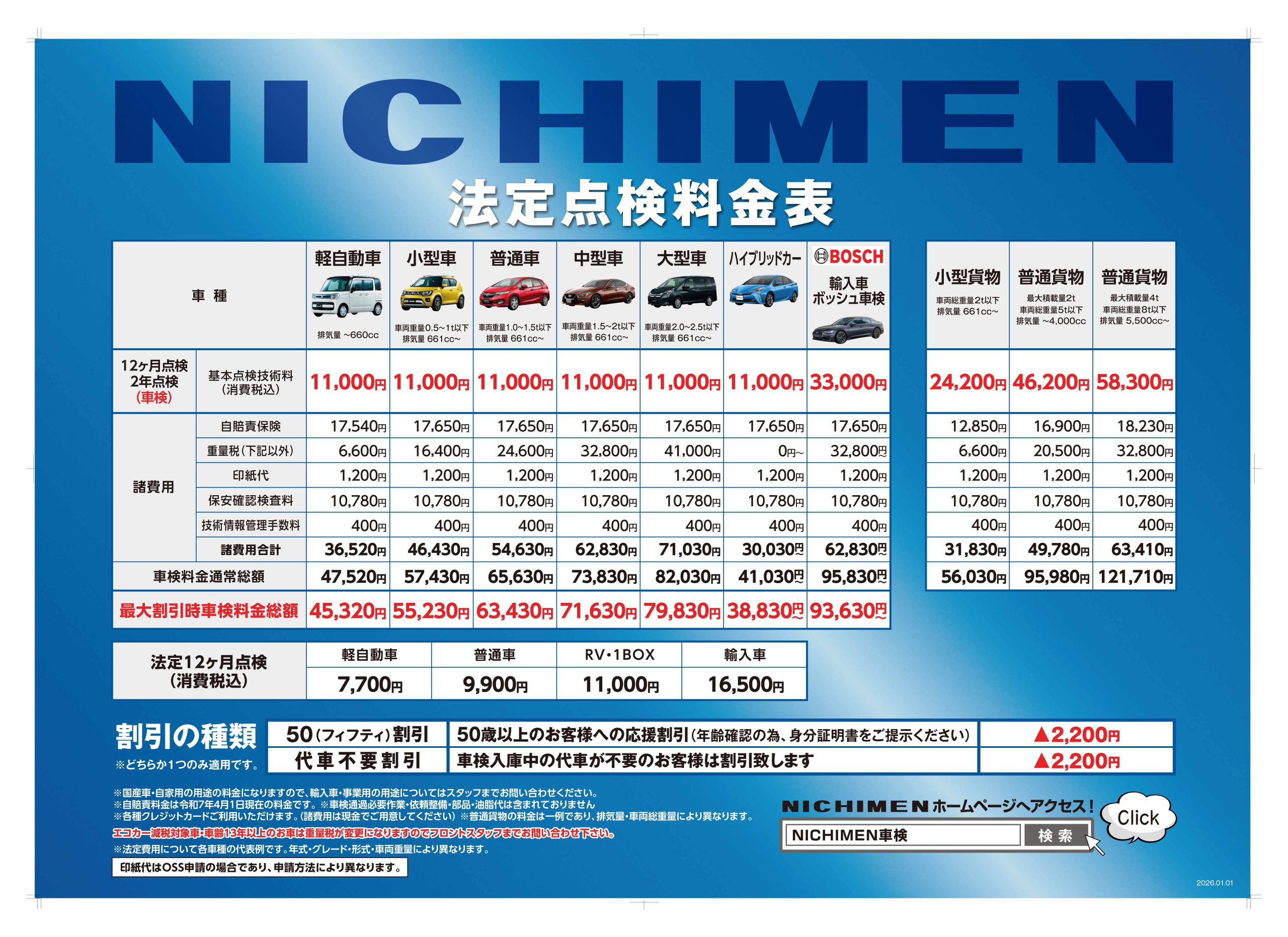 ※価格は国産車・自家用の用途の料金になります。※車検通過必要作業・依頼整備・部品・油脂代は含まれておりません。 ※各種クレジットカードご利用いただけます。(諸費用は現金でご用意してください) ※普通貨物の料金は一例であり、排気量・車両総重量により異なります。※自賠責料金は令和7年4月1日現在の料金です。 ※エコカー減税対象車・車齢13年以上のお車は重量税が変更になりますのでフロントスタッフまでお問い合わせ下さい。