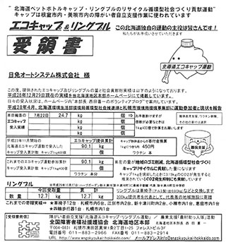 平成29年度に日免グループ全店舗のスタッフで収集したペットボトルキャップとリングプル、併せて25.1kgを今年もチャレンジ21北海道様へ寄贈しました。